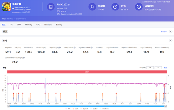 樂高無限手游里面有著豐富的物品種類,同樣非常占用手機資源,特效全開的情況下,realme 真我GT的平均幀為59.1幀,成績沒有達到60幀滿幀,說明樂高無限還是比較吃配置的(渣優(yōu)化),期待開放120Hz高刷后的成績表現(xiàn)。
