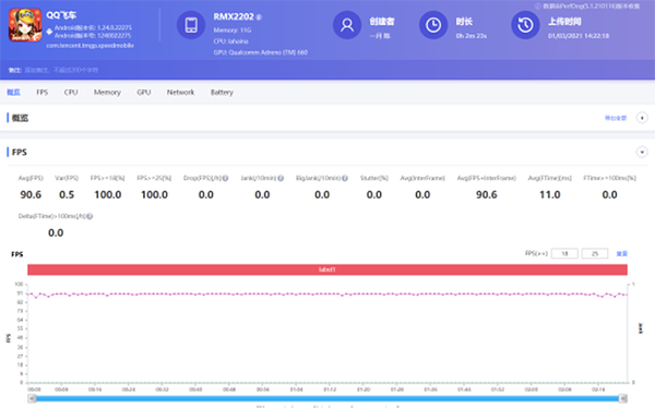 QQ飛車手游是最早支持高幀率模式的手游之一,對于realme 真我GT也是直接支持到了90Hz的高刷新率,未來上市之后還將支持到更高的120Hz模式。高刷玩游戲就是不一樣,多玩幾盤高刷游戲就再也沒辦法直視自己60Hz的手機了,QQ飛車手游平均幀為90.6幀,驍龍888表示毫無壓力。