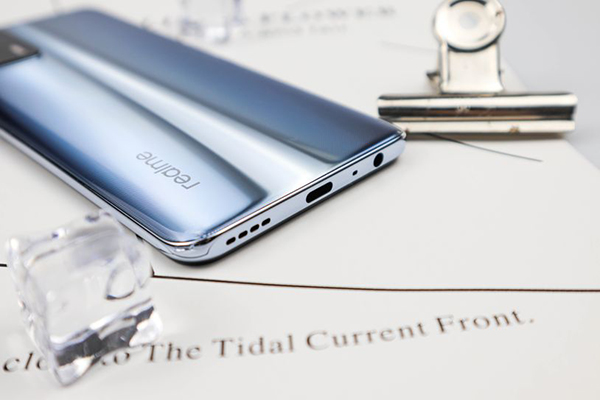 realme真我GT的底部實拍,共設有3.5mm音頻接口、Type-C接口、麥克風以及揚聲器。值得一提的是,realme真我GT為雙揚聲器設計,一個在底部、一個則在頂部的聽筒區(qū)域,雙揚聲器的設計,不管是玩游戲亦或是看電影,都能帶來不錯的聽感體驗。