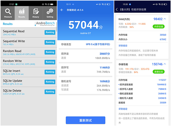 而在在AndroBench5的存儲(chǔ)與性能測(cè)試中,realme真我GT手機(jī)也給出了很不錯(cuò)的成績(jī),順序讀取速度為1842.42MB/s,順序?qū)懭胨俣葹?65.4MB/s,而在安兔兔與魯大師的存儲(chǔ)性能測(cè)試中,同樣也獲得相近的成績(jī)。