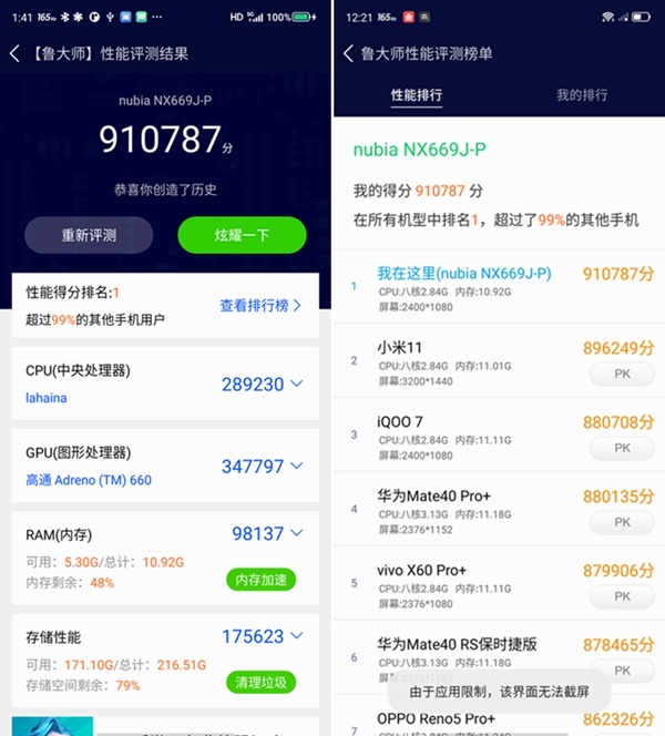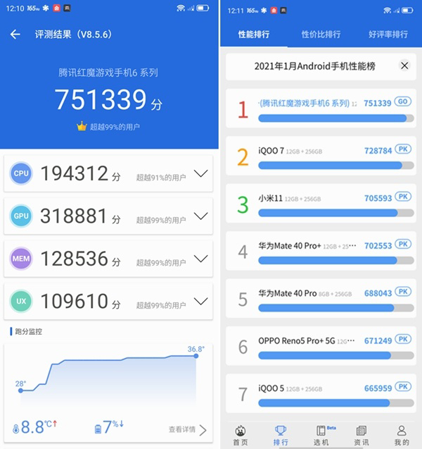 在跑分的環(huán)節(jié)中,騰訊紅魔游戲手機(jī)6 Pro安兔兔跑分為751339分,魯大師為910787分,兩個(gè)得分都位列排行榜第一。不得不說,由于LPDDR5的加入,讓應(yīng)用調(diào)取與緩存的速度,還有后臺(tái)多開更加穩(wěn)定。而UFS3.1閃存則支持包括寫入增強(qiáng)器、深度睡眠和性能調(diào)整通知這三個(gè)特性,用游戲玩家的形容就是很少會(huì)出現(xiàn)進(jìn)度條“焦慮”。