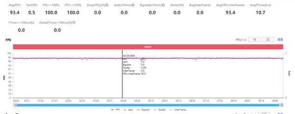 在王者榮耀新開放的90幀模式中,魅族18 Pro作為參與的機(jī)型,幀率表現(xiàn)非常不錯。通過幀率圖看到,平均幀率為93.4,整體曲線波動平穩(wěn)。實際體驗中,在特效全開的情況下,游戲沒有卡頓、掉幀的現(xiàn)象。即便在爆發(fā)大型團(tuán)戰(zhàn)的情況下,魅族18 Pro仍舊完美勝任王者榮耀的最高幀率模式,帶來了絲滑操作的體驗。