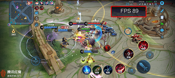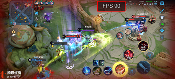 進(jìn)入游戲之前我們把畫面設(shè)置所有選項(xiàng)開到最高,并且開啟90Hz模式(這是王者更新了90Hz后我第一次上峽谷),我們可以看到,在紅魔6 Pro上,最優(yōu)畫面的王者榮耀,畫面幀率保持在89~90幀之間,哪怕是打團(tuán)站,滿屏都是魔法,都很穩(wěn)。我用的白起,二技能大鉤子是要隨時(shí)改變方向才能提高命中率的,在90Hz模式下,技能圈轉(zhuǎn)起來完全沒有“硌手”感了,真正指哪兒打哪兒,回頭讓我玩鐘馗的朋友也來試試。