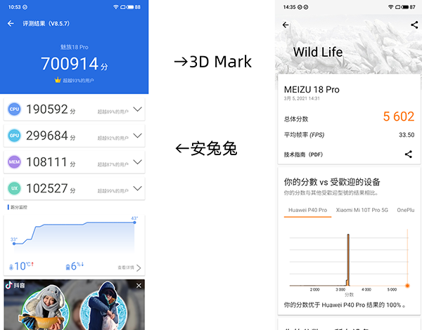 從實際性能測試來看,魅族18 Pro在安兔兔跑分中可以跑出70W+的平均分,3DMark最高分5602分,算是驍龍888的平均表現(xiàn)。這樣的硬件水平,可以說不管是日常聊天、刷抖音還是硬核游戲,魅族18 Pro都能輕松應(yīng)付。