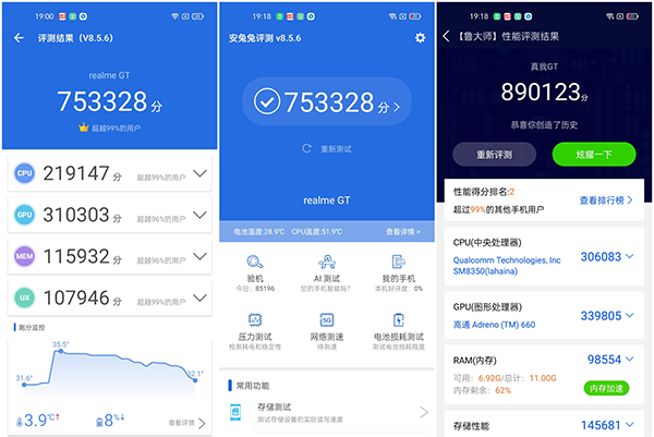 跑分測試中,realme真我GT安兔兔得分753328分,魯大師得分890123分,都處于目前安卓旗艦手機第一梯隊的水平。
