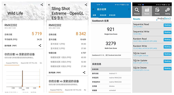 3DMark測試,realme GT在渲染分辨率為2K的Wild Life測試中得分為5719,Sling Shot測試得分8342,表現搶眼。滿血版LPDDR5+UFS3.1閃存的組合,在Geekbench 5測試中單核成績921分,多核成績3279分,寫入速度為767.04MB/s,讀取速度為1857.28MB/s,正因為強悍硬件的加持,realme GT運行多個APP和游戲,切換依然流暢。