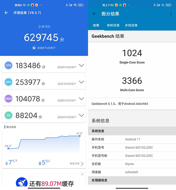 跑分方面,小米10S在安兔兔平臺(tái)上得分為62.9w分,略高于去年搭載驍龍865的旗艦機(jī)型。而在更加注重CPU性能測(cè)試的GeekBench 5上,小米10S單核得分為1024,多核得分為3366。