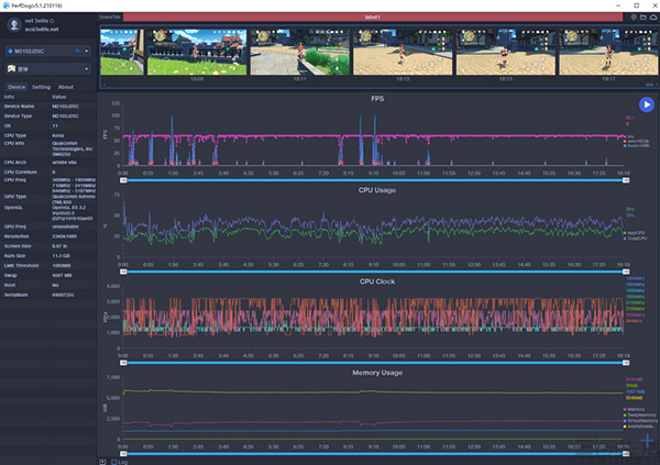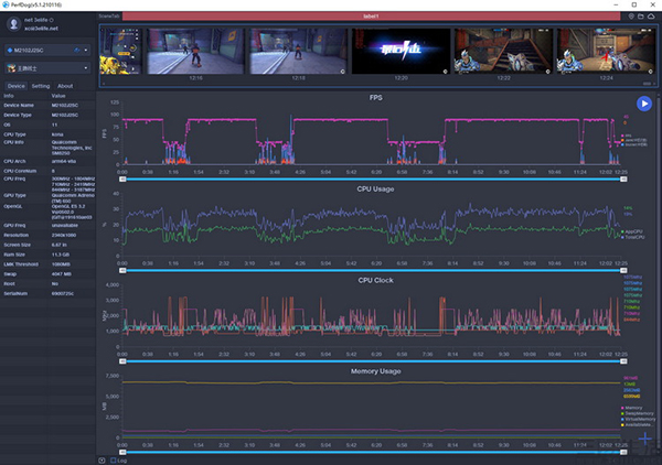 首先說結(jié)論,就是小米10S的表現(xiàn)非常令我們感到驚喜,因為它真的“只用”驍龍870就實現(xiàn)了一條非常平直,就得到了幾乎跑滿60幀的《原神》幀率曲線。它是如何做到的?觀察CPU的主頻曲線不難發(fā)現(xiàn),小米10S的秘密在于它非常積極地調(diào)度了驍龍870的全部核心,甚至3.2GHz的“超大核”在大多數(shù)時間都維持在“滿血”頻率上。換而言之,這至少說明了兩點,一是小米10S的性能調(diào)度非常積極,其二則是它的散熱很靠譜。