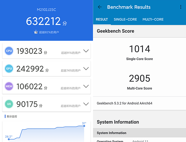 跑分環(huán)節(jié)依舊選擇了安兔兔、魯大師和GeekBench5三款軟件。實(shí)測(cè),小米10S安兔兔成績(jī)?yōu)?32212分、魯大師849065分、Geekbench5單核1014分,多核2905分。另外,這次小米在其內(nèi)部采用了大面積導(dǎo)熱材料,無(wú)需擔(dān)心散熱問(wèn)題。