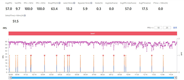 《原神》全高畫(huà)質(zhì)60幀下15分鐘后平均可以跑到57幀(測(cè)試的場(chǎng)景可能相對(duì)沒(méi)有那么吃性能),幀率波動(dòng)9.7,波動(dòng)更多出現(xiàn)在后期。