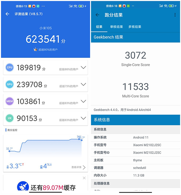 首先是GeekBench 4和安兔兔的跑分測試,前者測試得到驍龍870的單核得分達到了3072分,而多核得分為11533分,已經達到了當下手機處理器性能的第一梯隊,與此同時安兔兔的跑分達到了623541分,也算是一個不錯的成績。
