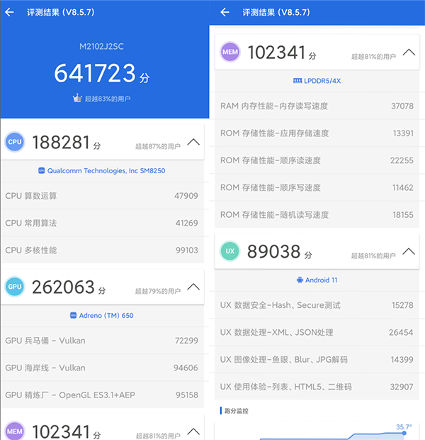 小米10S的安兔兔跑分為641723分,相較于過去驍龍865普遍55W的得分,主要提升體現(xiàn)在GPU、內(nèi)存核UX性能上。
