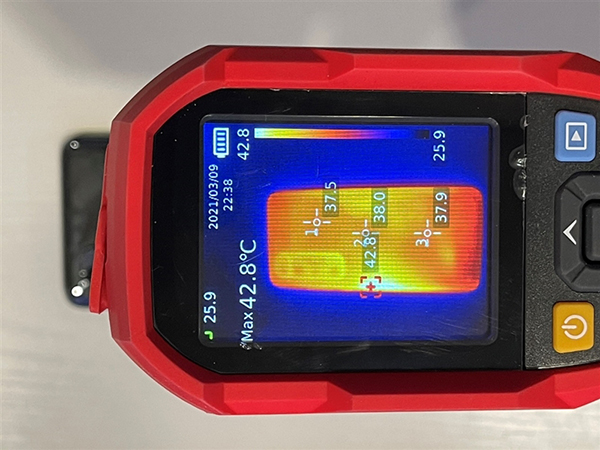 游玩《原神》10分鐘,整個背板都已經(jīng)十分溫?zé)幔褂脽嵯駜x測試,平均溫度均在38℃上下,可見VC均熱板確實起到了作用。發(fā)熱最大的位置在正中靠近測邊框處,溫度為42.8℃。