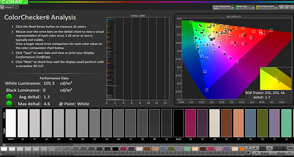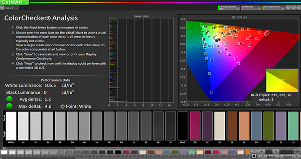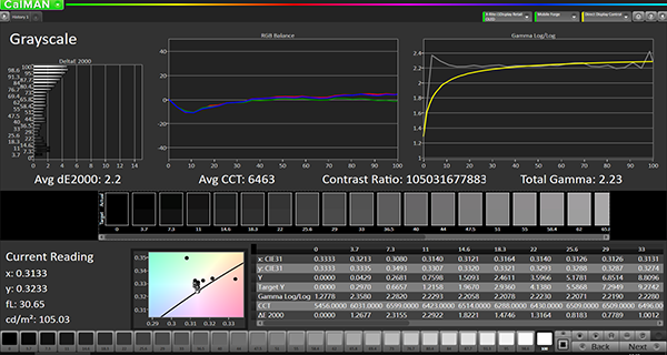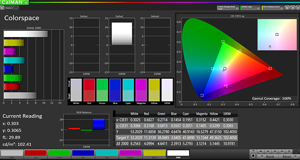 影院模式的Display P3色域覆蓋99.6%,伽瑪2.23,灰階偏離2.2,平均色偏1.3,最大4.6。