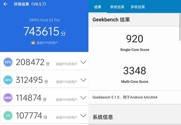 跑分測(cè)試中,在室溫22℃的情況下,OPPO Find X3 Pro安兔兔跑分達(dá)到了743615分,而在Geekbench 5中,單核成績(jī)達(dá)到了920,多核成績(jī)?yōu)?348,性能表現(xiàn)出色。