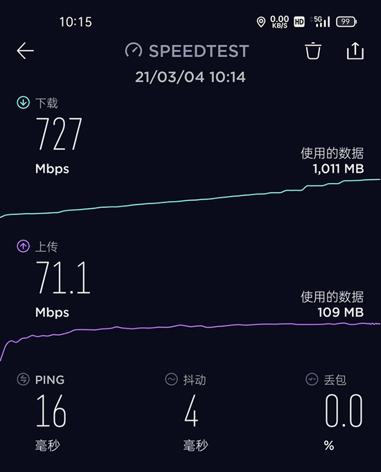 當然,我相信大多數朋友還是比較關心OPPO Find X3 Pro在5G網絡下的真實表現的,這里我們也通過權威網絡測速軟件Speedtest對其進行了在網5G測試,從實測結果來看,OPPO Find X3 Pro等峰值下載速率超過了727Mbps,符合我們對5G網絡速率的預期。