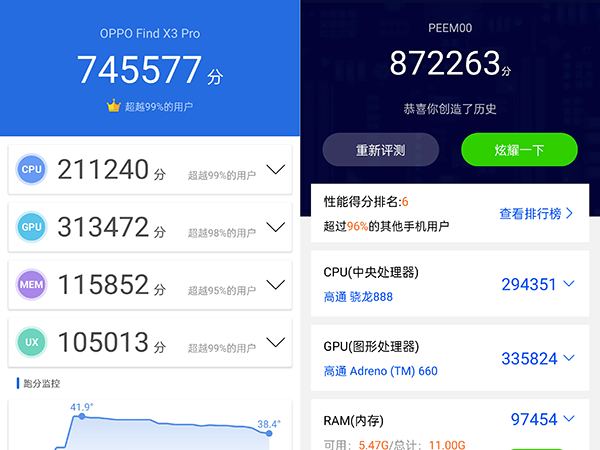 實(shí)測(cè),OPPO Find X3 Pro安兔兔跑分成績(jī)?yōu)?45577分,魯大師成績(jī)?yōu)?72263分。值得一提的是,在這款產(chǎn)品上,OPPO為其搭載了自家的O-Sycn超頻響應(yīng)技術(shù),用來(lái)提升游戲過(guò)程中屏幕與處理器之間的同步頻率,OPPO稱可以將延遲降至5-10毫米的水平,游戲玩家應(yīng)該會(huì)比較喜歡。