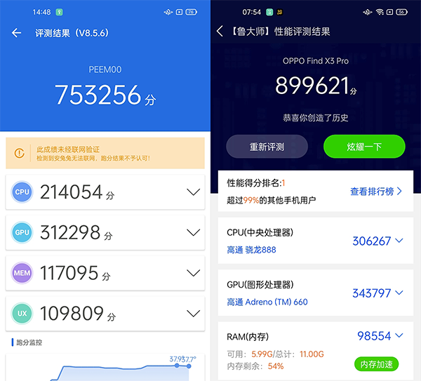 筆者用安兔兔和魯大師兩款性能測(cè)試App對(duì)其進(jìn)行了跑分測(cè)試,前者得分為75.3萬(wàn),而后者跑分也為89.9萬(wàn),同時(shí)在跑分過(guò)程中溫度的控制也比較理想。在最近的新品中,F(xiàn)ind X3 Pro在實(shí)際環(huán)境下的跑分暫列第一位。