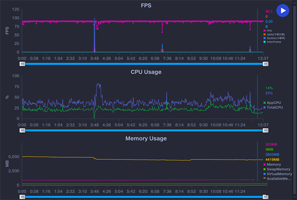 《QQ飛車》的持續(xù)幀率監(jiān)測(cè)軟件的表現(xiàn),要比《王者榮耀》更加穩(wěn)定,除了前后CG加在過(guò)場(chǎng)時(shí)會(huì)出現(xiàn)幀率切換導(dǎo)致的波動(dòng)外,在實(shí)際游戲環(huán)節(jié)中,幀率表現(xiàn)非常平穩(wěn)。