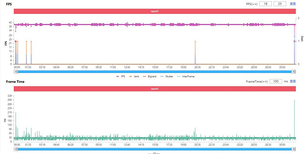 但令人疑惑的是,整個(gè)過程中筆者并沒有感受到明顯的卡頓情況。來看幀數(shù)曲線和渲染曲線,幀數(shù)顯示全程除了跳傘和最后吃雞頁面結(jié)算時(shí)有明顯下降,其余時(shí)候基本保持在38fps以上,呈現(xiàn)出比較平穩(wěn)的幀率效果。從幀畫面渲染時(shí)間來看,也只有開場和結(jié)束的時(shí)候會(huì)有卡頓,而且?guī)瑪?shù)下降的幅度似乎也并沒有出現(xiàn)明顯卡頓的前提條件,單幀畫面渲染時(shí)間低于100ms,放在1s的渲染周期內(nèi),其實(shí)根本很難感受得出來,或許對(duì)畫面幀數(shù)更為敏感的人會(huì)有更多的體會(huì)。
