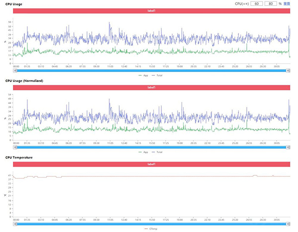另一方面,或許會(huì)有人懷疑手機(jī)核心溫度散不出去,機(jī)身溫度才會(huì)這么低,我們從Perfdog上找到了溫度數(shù)據(jù),結(jié)合CPU本身的使用率來看,高通驍龍888的核心溫度可以保持在40℃左右,與之前三次安兔兔跑分測試得到的數(shù)據(jù)比較類似,應(yīng)該有一定的參考性。
