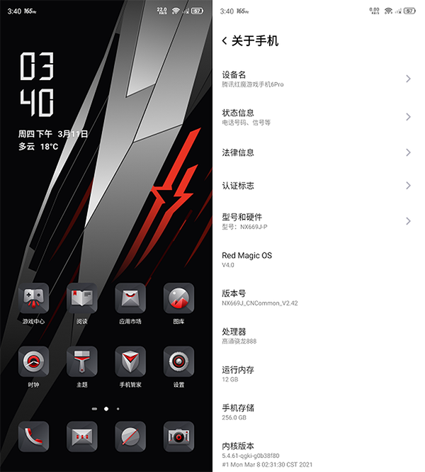 在這個(gè)系統(tǒng)交互方面,騰訊紅魔游戲手機(jī)6 Pro搭載了基于Android 11打造的RedMagic OS 4.0系統(tǒng),能夠顯著提升游戲加載、游戲運(yùn)行以及渲染適配方面的綜合體驗(yàn),深化騰訊游戲優(yōu)化體驗(yàn)。盡管是游戲手機(jī)的定制系統(tǒng),但RedMagic OS 4.0基本上沒(méi)有預(yù)裝太多額外軟件,常用的游戲軟件僅僅是紅魔裝備庫(kù)APP,用于適配調(diào)節(jié)游戲耳機(jī)、散熱背夾以及游戲手柄。