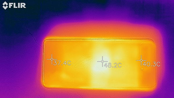 我們這次是使用《和平精英》作為負載,手機開啟X模式,在連續(xù)運行3場完整的游戲之后,從手機背面的熱成像圖可以看出,手機溫度最高的地方確實是在中部,溫度達到了48℃,兩端的溫度是37℃和40℃,雖然不能說燙手,但卻是會感覺到熱量。
