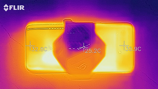 如果說上面的測試偏理論,不能代表實際使用感覺的話,那么我們來看看實際游戲中,騰訊ROG游戲手機5背面兩端的溫度表現(xiàn)。為什么要看這個位置呢?這是因為在無論是橫屏游戲還是豎屏游戲,手機兩端基本上都是手接觸的地方,這里的溫度會直接影響到玩家的手感。