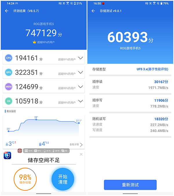 根據(jù)安兔兔跑分測試,筆者手上這臺ROG5頂配18+512GB版本跑分成績?yōu)?47129分,CPU分數(shù)為194161分,GPU分數(shù)為322351分,存儲測試成績?yōu)?0393分。