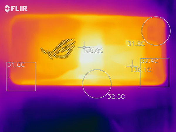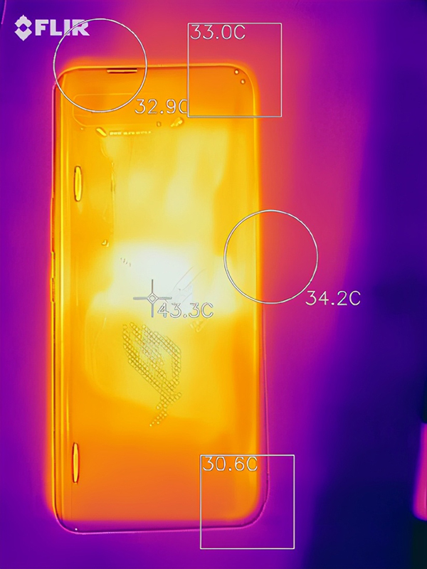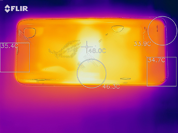 溫度方面,在室溫26℃的辦公室環(huán)境中,游戲過程中的CPU溫度在55℃~60℃浮動,雖然這個溫度看上去較高,但實(shí)際上反映到玩家實(shí)際觸摸的感受才是真實(shí)的溫度感受。我們用熱成像儀探測了手機(jī)的表面溫度,可以看到由于SOC的中置設(shè)計(jì),手機(jī)的溫度主要集中在手機(jī)中心部分,溫度為48℃左右。而玩家的手能夠觸及的部分,溫度則在35℃左右,不會有很燙手的感覺。