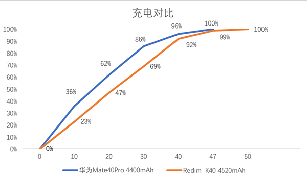從測(cè)試的結(jié)果來看,華為Mate40 Pro充滿電時(shí)間為47分鐘,K40為50分鐘,華為Mate40 Pro平均充電效率93.6mAh/min,K40平均充電效率90.4mAh/min,在平均充電效率上兩者旗鼓相當(dāng)。