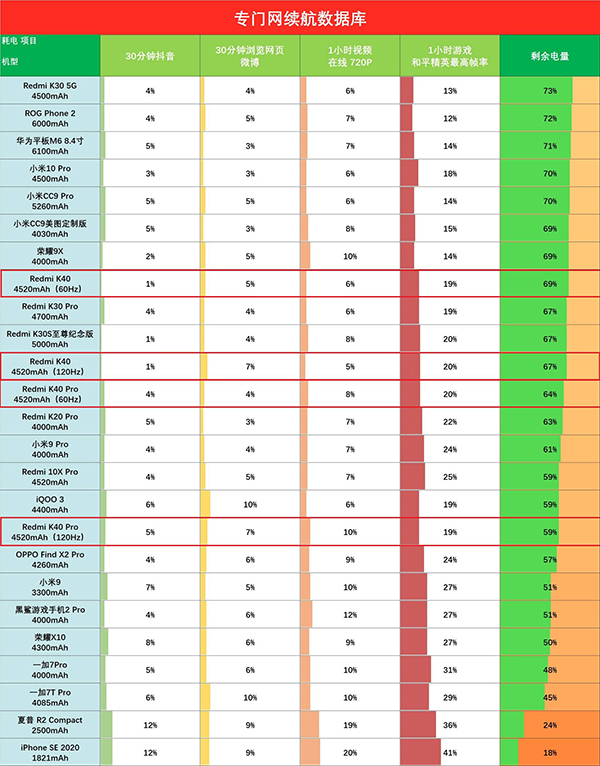 相比K40,搭載驍龍888的K40Pro在視頻觀看上(抖音、720p視頻)要更耗電一些,其它方面則相差不大。和Redmi K40一樣,Redmi K40 Pro開啟60Hz和120Hz的差別主要表現(xiàn)在瀏覽信息流上。而總體來看,Redmi K40 Pro的續(xù)航表現(xiàn)要比Redmi K40稍弱一些。