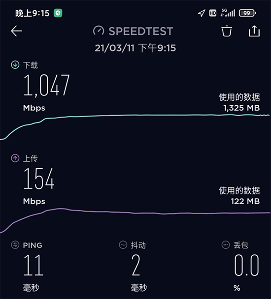 由于搭載了驍龍888,Redmi K40 Pro還具備了全面的網(wǎng)絡(luò)連接能力。集成的驍龍X60 5G基帶,不是外掛5G,并且支持5G Sub-6GHz載波聚合和毫米波,能夠提供高達7.5Gbps的商用5G網(wǎng)絡(luò)速度,支持幾乎全球所有主要網(wǎng)絡(luò)。實際測試中,我們在5G基站附近測試了它的5G速率,SpeedTest實測其下行速率為1047Mbps,上行速率為154Mbps,測試過程中Ping值低,抖動小,連接十分穩(wěn)定。