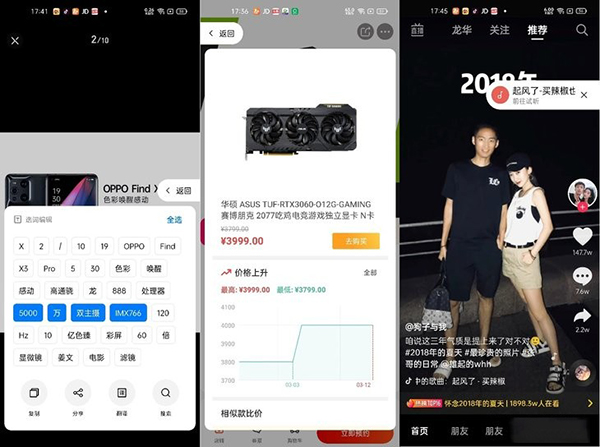 Breeno識(shí)屏同樣非常實(shí)用,它能隨時(shí)提取屏幕上顯示的內(nèi)容,哪怕是圖片中原本不可復(fù)制的文字,進(jìn)行復(fù)制搜索等操作;在商品頁面中使用Breeno識(shí)屏,它還能幫你快速查詢歷史價(jià)格或進(jìn)行相同商品比價(jià),告別反復(fù)切換比價(jià)軟件的繁瑣操作;在刷短視頻時(shí)我們常常聽到自己喜歡的BGM卻不知道曲名,這時(shí)候使用Breeno識(shí)屏同樣可以智能識(shí)別出來,實(shí)測(cè)準(zhǔn)確率非常高。
