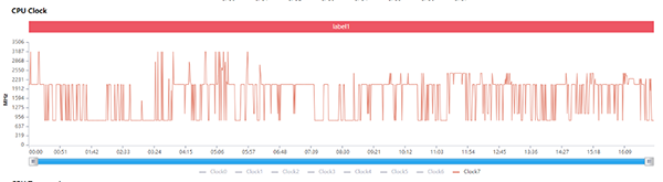 這充分體現(xiàn)了驍龍870的實用性。實際上在《和平精英》的HDR高清+極限幀率下,驍龍870更多時候還是在調(diào)用能效核心。從曲線上看超大核跑到極限頻率的機會很低,幾乎全程都在低頻狀態(tài)下運行。而三顆2.42Ghz的大核和1.8Ghz的小核就積極許多。