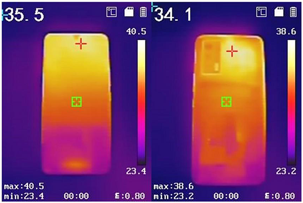 我們預(yù)料到高功率的充電器勢(shì)必會(huì)給手機(jī)帶來一些溫度上的上升,但實(shí)際上比我們想象中的溫度要低很多了。我們使用手持熱成像儀在即將完成充電時(shí)進(jìn)行了溫度測(cè)試,測(cè)試結(jié)果是正面最高40度,背面最高38.6度,整體熱量十分均勻,沒有出現(xiàn)部分大面積集熱的情況。當(dāng)時(shí)的室內(nèi)溫度為20度左右,這個(gè)溫度真的可以說是控制的很好了。