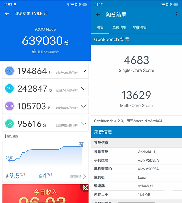 首先我們使用安兔兔和GeekBench進(jìn)行測(cè)試,安兔兔測(cè)試的是一款手機(jī)全方面的性能,而GeekBench測(cè)試的是一款處理器的單核與多核性能。在安兔兔測(cè)試中,iQOO Neo5的得分為639030分,這個(gè)成績(jī)已經(jīng)超越了絕大多數(shù)手機(jī),。在GeekBench中,iQOO Neo5搭載的這顆驍龍870單核成績(jī)?yōu)?683分,多核成績(jī)?yōu)?3629分。