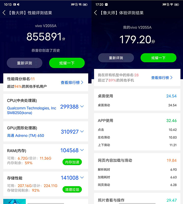 而在另一款大家喜聞樂(lè)見(jiàn)的測(cè)試軟件魯大師中,我們測(cè)試了性能與體驗(yàn)兩種。最終的結(jié)果為,在性能測(cè)試中,iQOO Neo5的得分為855891分,排名第11位,這也正印證了iQOO Neo5的性能之強(qiáng)勁。在體驗(yàn)評(píng)測(cè)中,iQOO Neo5則是得到了179.2分的好成績(jī),這也得益于基于安卓11的Origin OS的加入。