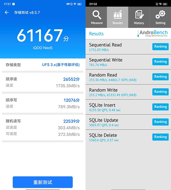 我們還使用AndroBench與安兔兔存儲(chǔ)測(cè)試對(duì)iQOO Neo5所搭載的這顆加強(qiáng)版UFS 3.1閃存進(jìn)行了測(cè)試,最后測(cè)得的成績(jī)順序讀取都在1700MB/s以上,順序?qū)懭攵荚?00MB/s以上,相對(duì)于標(biāo)準(zhǔn)版UFS 3.1獲得了一些提升。這樣的速度可以達(dá)到快速安裝軟件、快速加載游戲的效果。