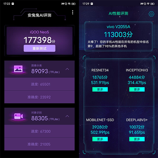 現(xiàn)如今,AI已經(jīng)成為了各大廠商爭(zhēng)相宣傳的賣點(diǎn)之一,所以我們按照慣例來(lái)進(jìn)行一下AI性能的測(cè)試。我們使用了AI Mark與安兔兔AI評(píng)測(cè)進(jìn)行了測(cè)試,最終在AI Mark中得到了113003分的好成績(jī),在安兔兔AI評(píng)測(cè)中得到了177398分的好成績(jī)。