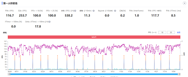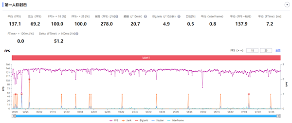 甚至在《穿越火線:槍戰(zhàn)王者》的部分模式——例如爆破模式中中,在開啟極高畫質(zhì)+極高幀率(官方標(biāo)稱120 FPS)后甚至跑出了最高137 FPS的幀率成績。這點(diǎn)也是令我們沒有想到的,畢竟市面上能夠在實(shí)際測試中跑出比官方標(biāo)稱最高幀率更高成績的機(jī)型是非常少見的。只不過在生化追擊模式下,該機(jī)在畫面中玩家較多的場景下幀率穩(wěn)定性相對一般,僅為116.7 FPS。