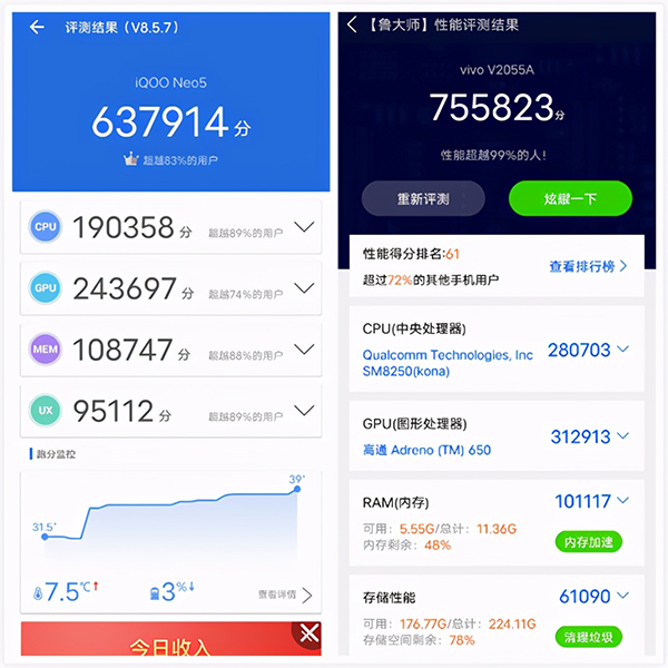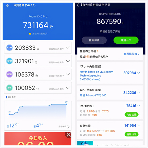 安兔兔和魯大師這兩款相對(duì)綜合的跑分平臺(tái)測(cè)試,從上面兩部手機(jī)的結(jié)果中我們可以很明顯的看到,Redmi K40 Pro安兔兔取得了731164分、魯大師平臺(tái)取得了867590分的最終成績(jī);iQOO Neo5安兔兔平臺(tái)取得了637914分、魯大師平臺(tái)取得了755823分的最終成績(jī)。正如直面參數(shù)所表現(xiàn)出的那樣,Redmi K40 Pro的跑分成績(jī)確實(shí)要強(qiáng)于iQOO Neo5 。