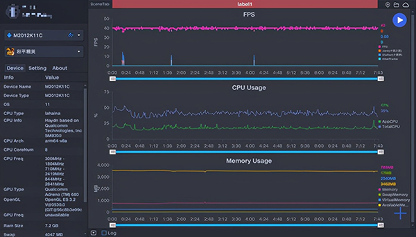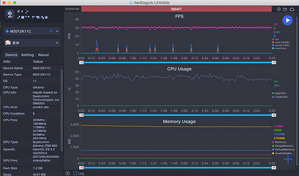 其次是《崩壞三》,結(jié)果證明,在這一環(huán)節(jié),iQOO Neo5 和Redmi K40 Pro的幀率表現(xiàn)仍舊難分伯仲,從上方的perfdog幀率圖中我們可以看到,兩部幀率曲線都十分的平穩(wěn)。