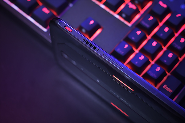 機身左側(cè)頂部那鮮紅一抹的是紅魔標志性的競技鍵,可以一鍵切換進入火力全開的游戲空間環(huán)境。讓游戲更有儀式感和沉浸感。下方是進氣柵格,同樣處理的更為平坦。