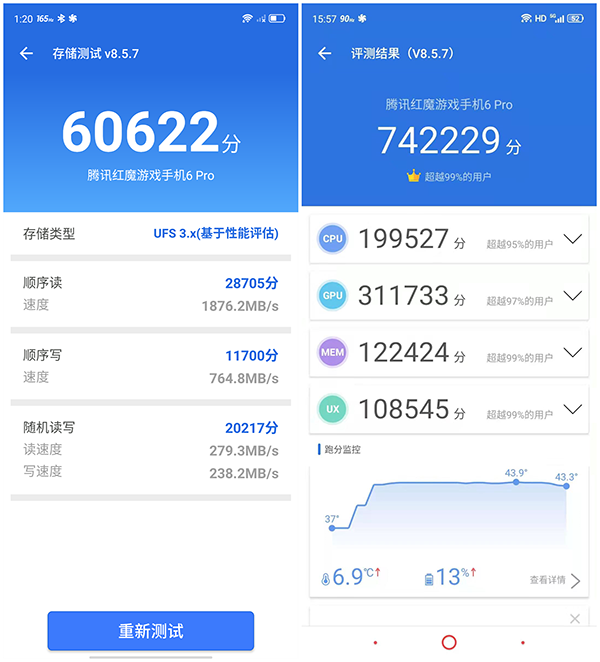 在基礎(chǔ)性能上面,紅魔6 Pro搭載了驍龍888旗艦處理器,外加滿血版LPDDR5運(yùn)存和UFS3.1閃存,這一全維度頂級(jí)配置組合使得正常使用期間直接拿來(lái)跑分,分?jǐn)?shù)達(dá)到74萬(wàn)2,順序讀取速度和順序?qū)懭胨俣确謩e達(dá)到了1876.2MB/S和764.8MB/S。雖然驍龍888作為今年的旗艦處理器,在性能上面可以說(shuō)是驍龍最好的產(chǎn)品了,但是在功耗上面也是讓大家所詬病的。不過(guò)得益于紅魔6 Pro優(yōu)秀的散熱能力,可以將驍龍888的實(shí)力全部發(fā)揮出來(lái)。