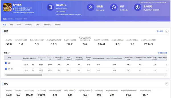 在該模式下,騰訊紅魔游戲手機(jī)6 Pro平均幀率為59.8fps,平均每十分鐘卡頓次數(shù)為1.0,平均每十分鐘卡頓次數(shù)為0.3,能耗值為2834.3。