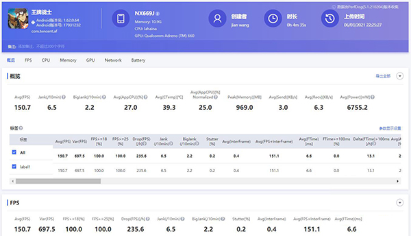 在《王牌戰(zhàn)士》中開啟165幀模式下,通過Perfdog幀率測(cè)試軟件對(duì)游戲?qū)崟r(shí)幀率進(jìn)行記錄。騰訊紅魔游戲手機(jī)6 Pro都能夠在最高畫質(zhì)下游戲4分鐘(該游戲每局時(shí)長(zhǎng)較短),平均幀率150.7fps,從幀率的變化表現(xiàn)來看,游戲?qū)?zhàn)的過程中始終處于幾乎滿幀的表現(xiàn),當(dāng)玩家人物被擊斃后,因游戲機(jī)制導(dǎo)致幀率下降60fps左右,人物重生完畢進(jìn)入戰(zhàn)場(chǎng)則瞬間升至165fps滿幀狀態(tài),整個(gè)游戲過程無任何遲滯,絲滑順暢。詳細(xì)數(shù)據(jù)具體如下圖: