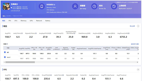 在《王牌戰(zhàn)士》中開啟165幀模式下,通過Perfdog幀率測試軟件對游戲實時幀率進行記錄。騰訊紅魔游戲手機6 Pro都能夠在最高畫質下游戲4分鐘(該游戲每局時長較短),平均幀率150.7fps,從幀率的變化表現(xiàn)來看,游戲對戰(zhàn)的過程中始終處于幾乎滿幀的表現(xiàn),當玩家人物被擊斃后,因游戲機制導致幀率下降60fps左右,人物重生完畢進入戰(zhàn)場則瞬間升至165fps滿幀狀態(tài),整個游戲過程無任何遲滯,絲滑順暢。詳細數(shù)據(jù)具體如下圖: