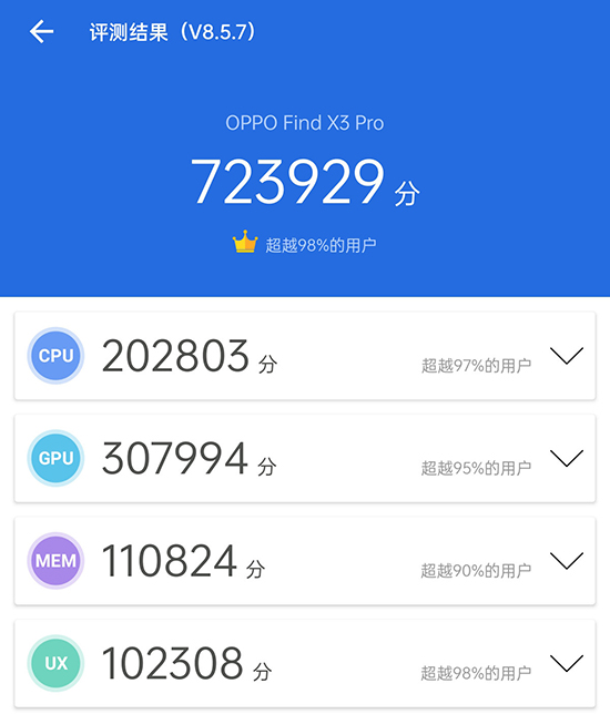 從參數(shù)來看,OPPO Find X3 Pro是一款集合了目前頂級(jí)配置的旗艦手機(jī)。在安兔兔測(cè)試當(dāng)中,它也跑出了大概 72.4 萬分的成績(jī),理論性能毋庸置疑。