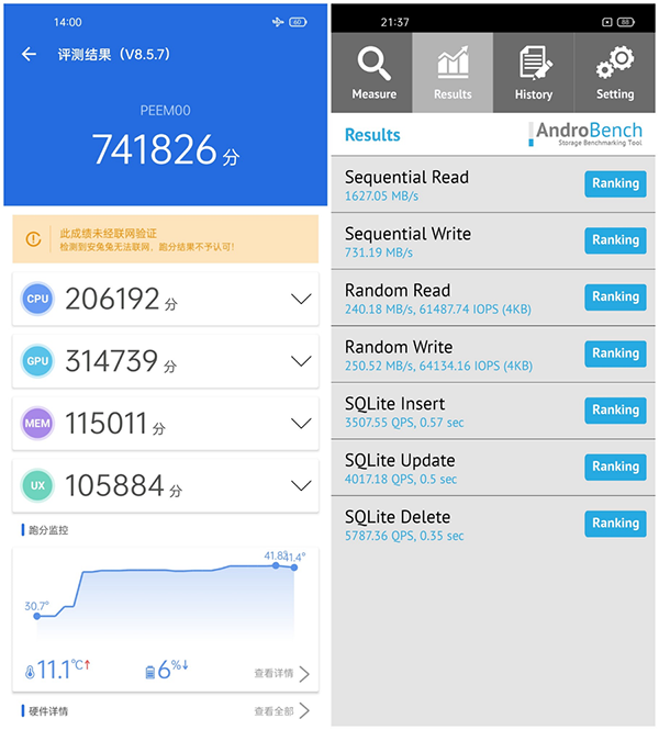 首先在安兔兔性能測(cè)試中,OPPO Find X3 Pro總分高達(dá)74萬(wàn),高于目前驍龍888機(jī)型的平均水準(zhǔn),閃存的讀寫(xiě)性能也達(dá)到了驍龍平臺(tái)搭配UFS3.1的滿血水平,理論性能表現(xiàn)不錯(cuò)。